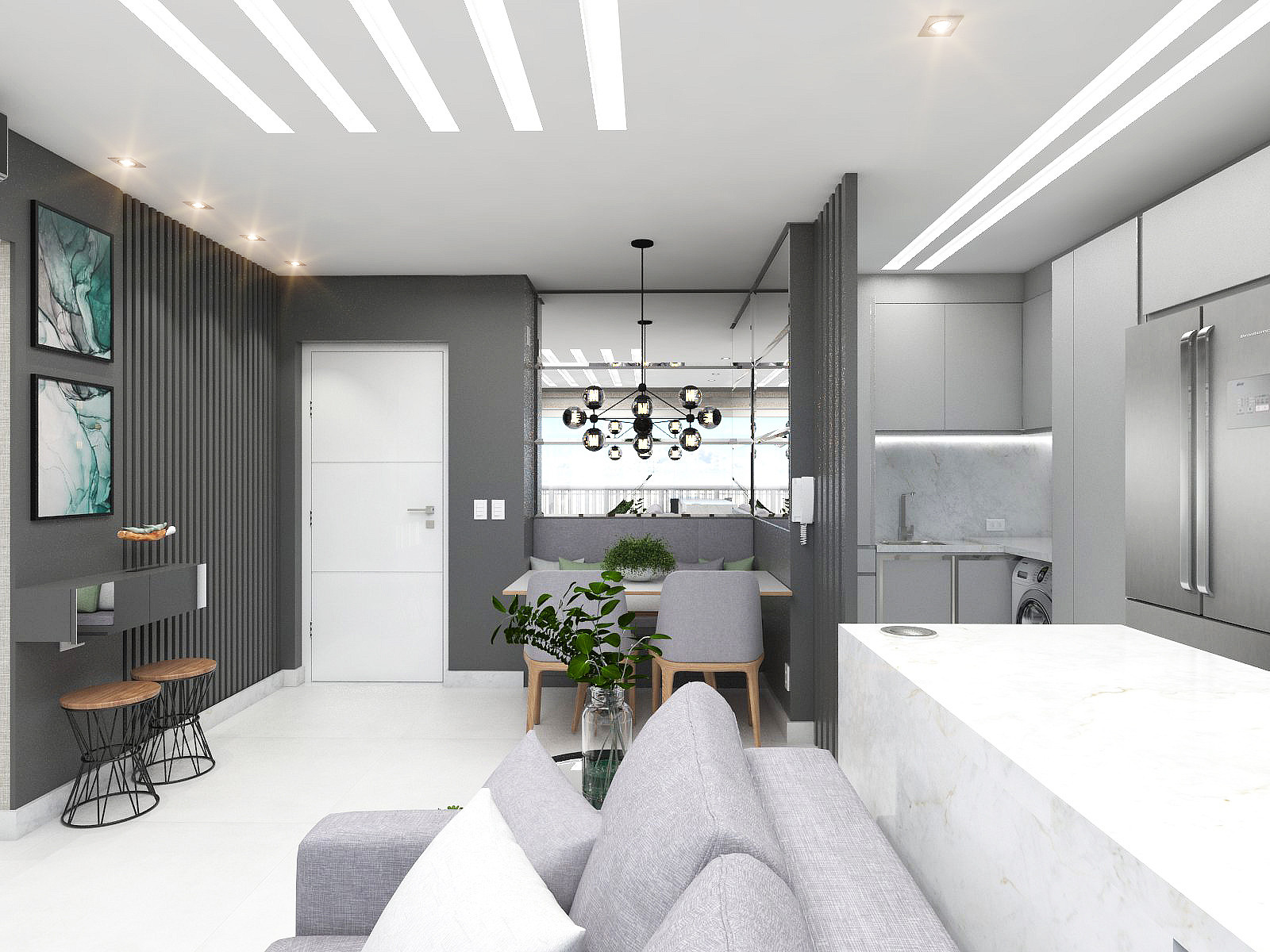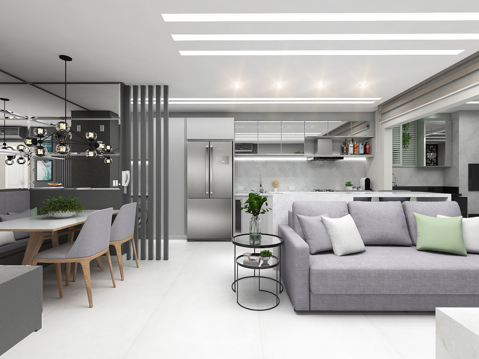 A sensação de amplitude e o convívio entre as pessoas são alguns dos pontos positivos na integração de ambientes. Para que os espaços integrados tenham unidade, alguns pontos são imprescindíveis. Utilizar o mesmo piso é um deles, o que ainda aumenta a sensação de espaço. A iluminação, é ponto chave para valorizar a decoração, também deve seguir a mesma linha por todos os ambientes. Do ponto de vista da decoração, apostamos em tons neutros para deixar o ambiente clean.